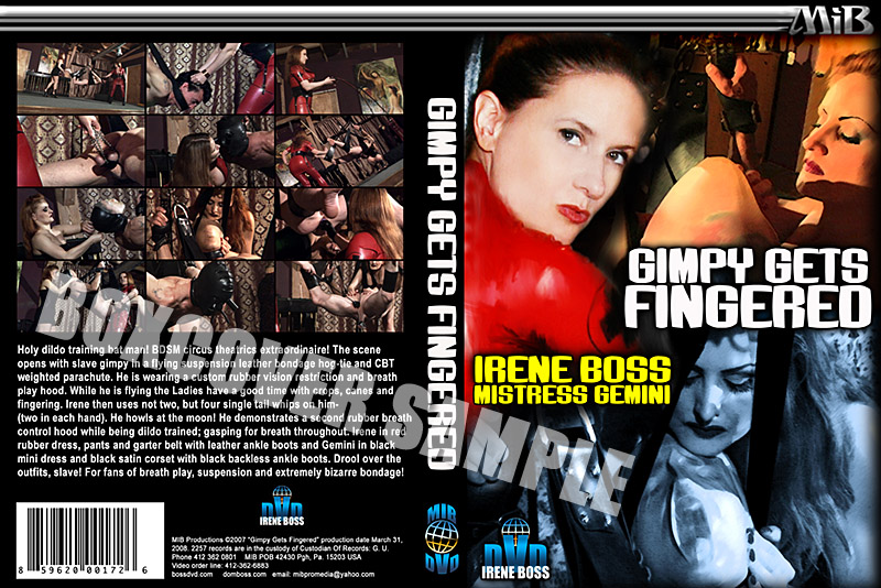 Holy dildo training bat man! BDSM circus theatrics extraordinaire! The scene opens with slave gimpy in a flying suspension leather bondage hogtie and CBT weighted parachute. He is wearing a custom rubber vision restriction and breath play hood. While he is flying the Ladies have a good time with crops, canes, fingers and strapons. He demonstrates a second rubber breath control hood while Irene uses not two, but four single tail whips on him (two in each hand). He howls at the moon! Irene in red rubber dress, pants and garter belt with leather ankle boots and Gemini in black mini dress and black satin corset with black backless ankle boots. Drool over the outfits, slave! For fans of breath play, suspension and extremely bizarre bondage!